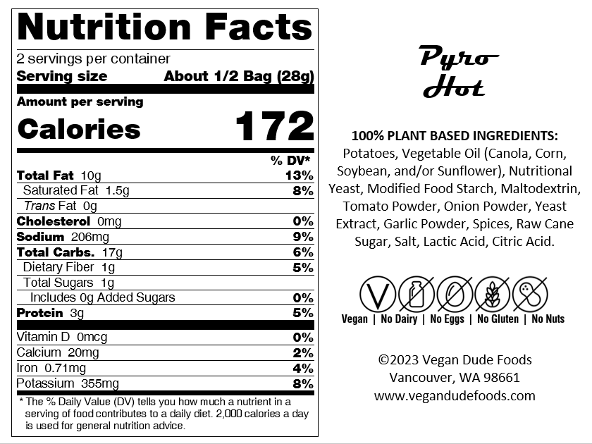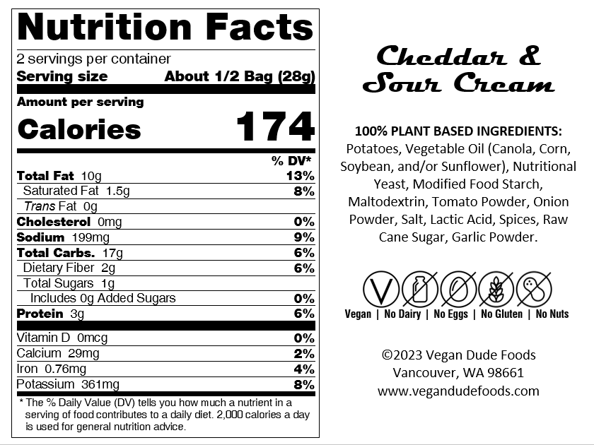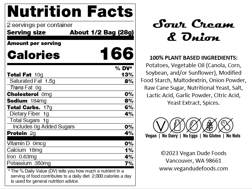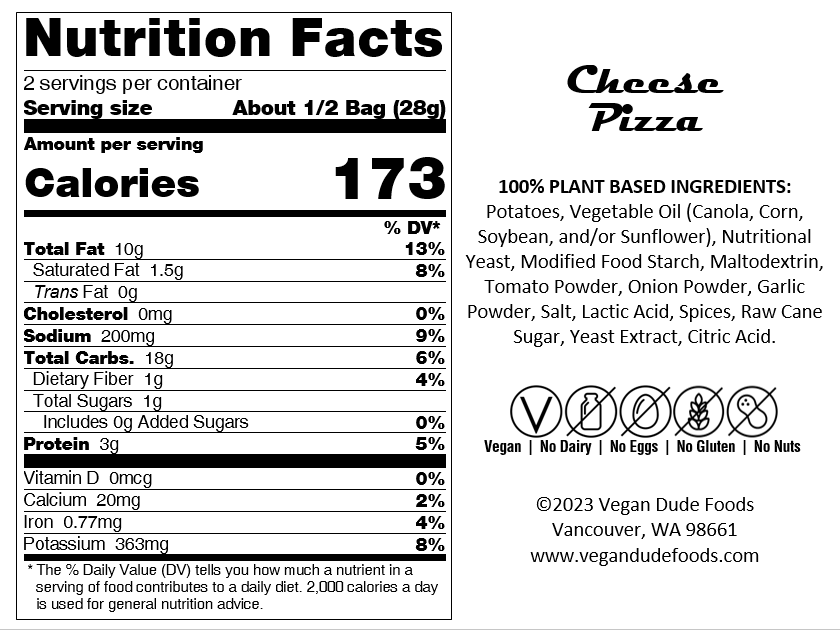 Welcome to Vegan Dude Foods. We strive to provide the best tasting all vegan snack foods around. We only use high quality plant based ingredients in our products, so they are always free of animal products and byproducts including eggs, dairy, and honey. We do not use any artificial colors, flavors, or preservatives.